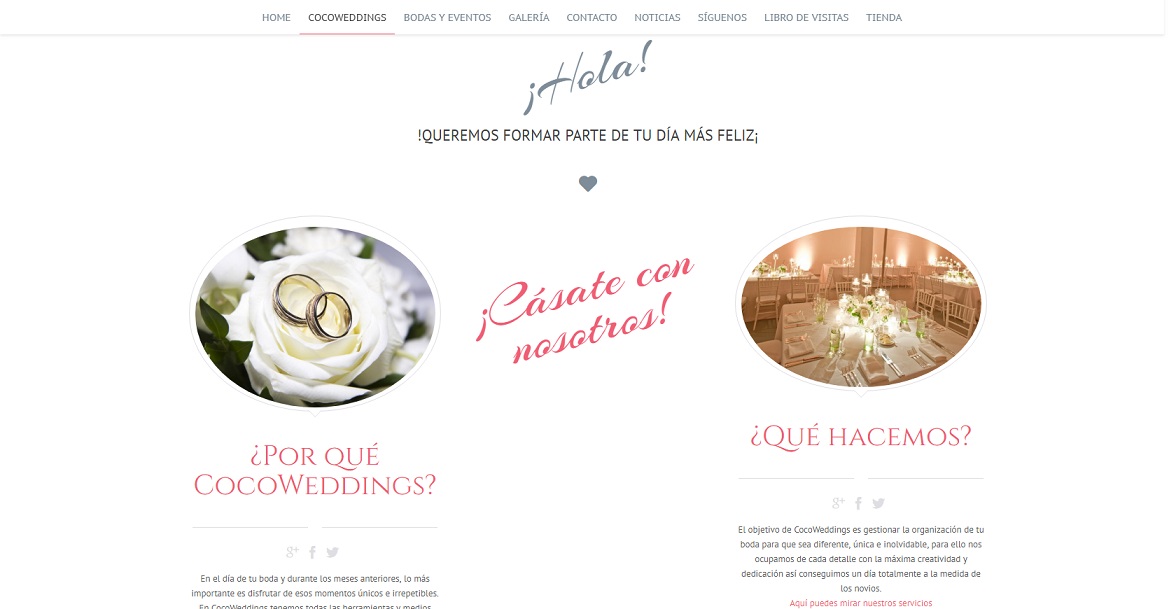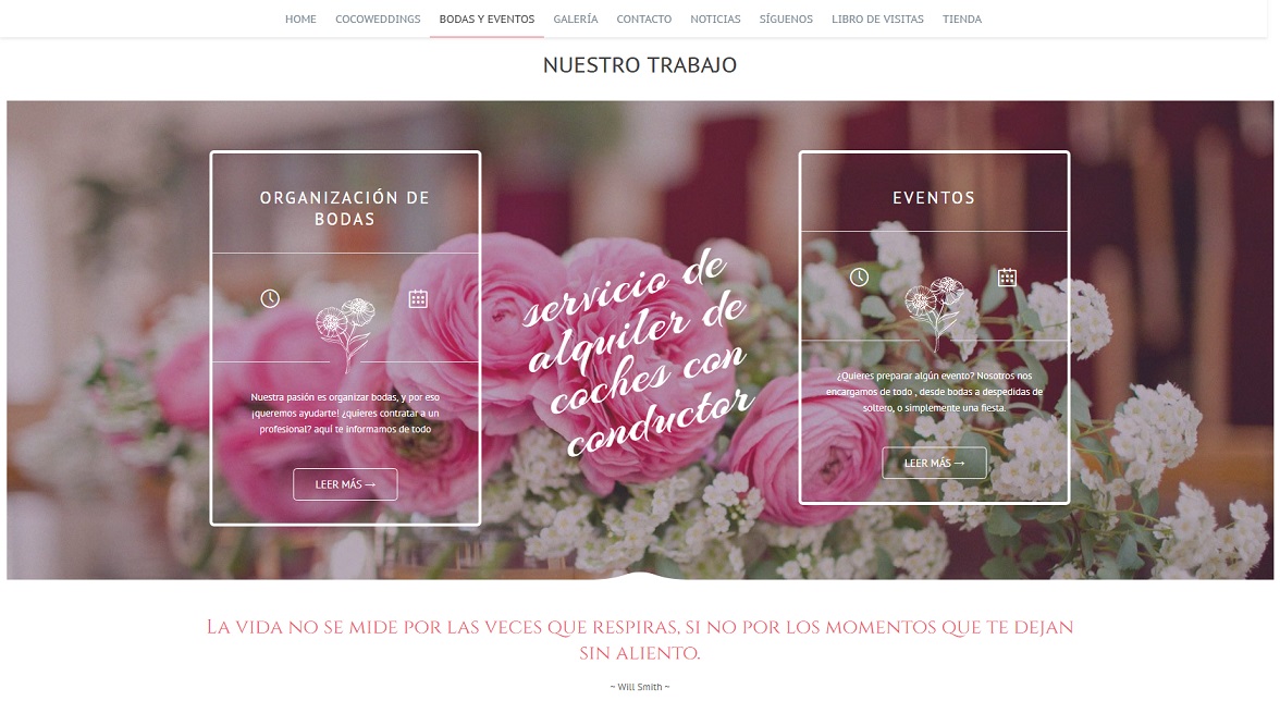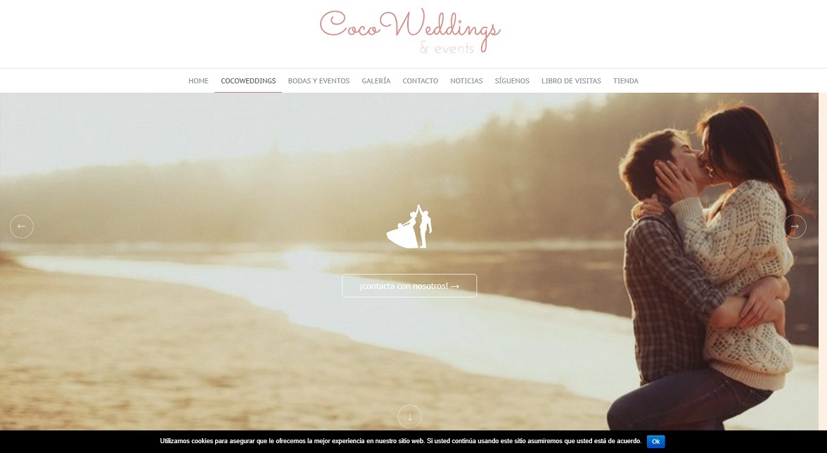 Cocowedding and events es una empresa fundada por Almudena. Ella, como todos los que fundan su empresa tiene la ilusión de trabajar de organizadora de bodas. Ella misma creó su logotipo e imagen corporativa, pero necesita una ayuda para crear su web. Contacto conmigo y trabajemos juntos para crearla. El resultado fue una web muy vistosa que le ayuda en su trabajo. La web es autoadministrable donde trabaje todo el diseño a gusto de Almudena. Además le añadimos una tienda online donde vende artículos para bodas.